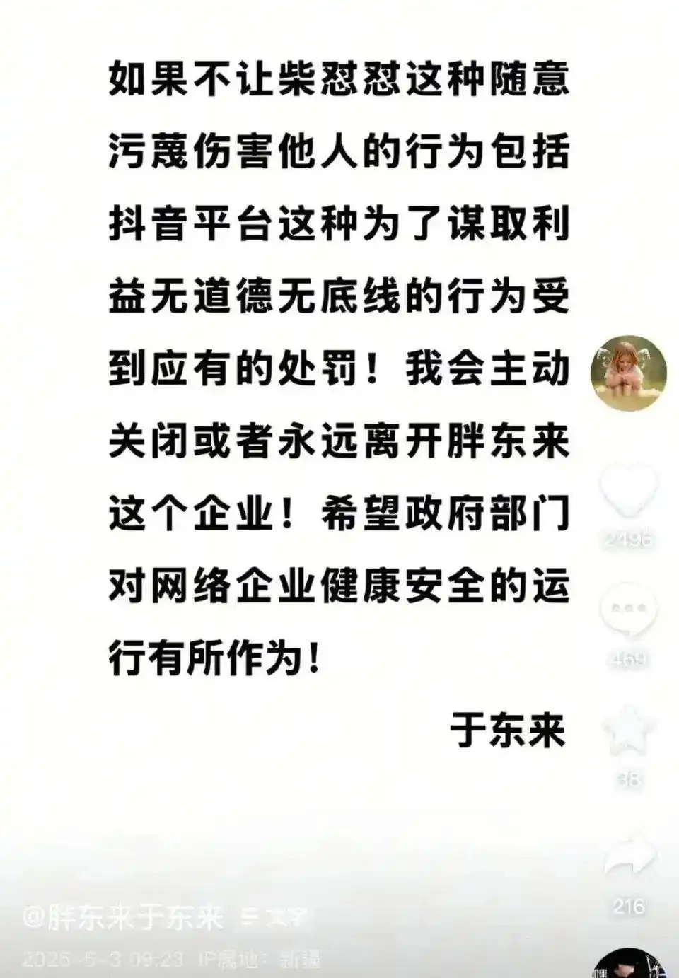 值得注意的是,5月份,于东来与网红互怼后将个人社交账号设为私密,曾称对方若不受处罚会关闭胖东来。